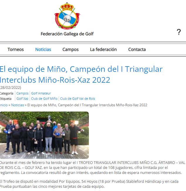 Durante el mes de febrero ha tenido lugar el I TROFEO TRIANGULAR INTERCLUBS MIÑO C.G. ÁRTABRO – VAL DE ROIS C.G. – GOLF XAZ, en la que han participado un total de 108 jugadores, cifra limitada por el reglamento. La convocatoria resultó de gran interés, quedando en lista de espera numerosos interesados.
