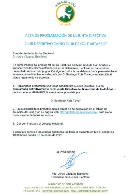 NoticiasMiño Club de Golf Ártabro – Junta_Electoral: Publicación de las candidaturasACTA PDF santirt@gmail.comenero 31, 2020