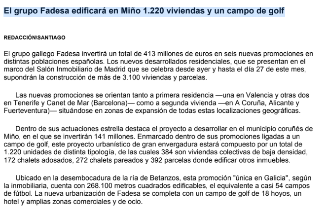 El Correo Gallego: El grupo Fadesa edificará en Miño 1.220 viviendas y un campo de golf