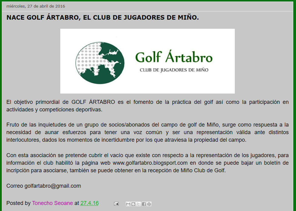 Un grupo de jugadores abonados deciden asociarse según contempla la Ley del Deporte gallea, creando un Club Deportivo, un Club de Golf. El 14 de Abril de 2016 se inscribe en la Xunta GOLF ÁRTABRO, Nº de Registro C-12616. Se decide no federarse ya que el club vinculado al campo seguía siendo el GC17 MIÑO GOLF CLUB.
